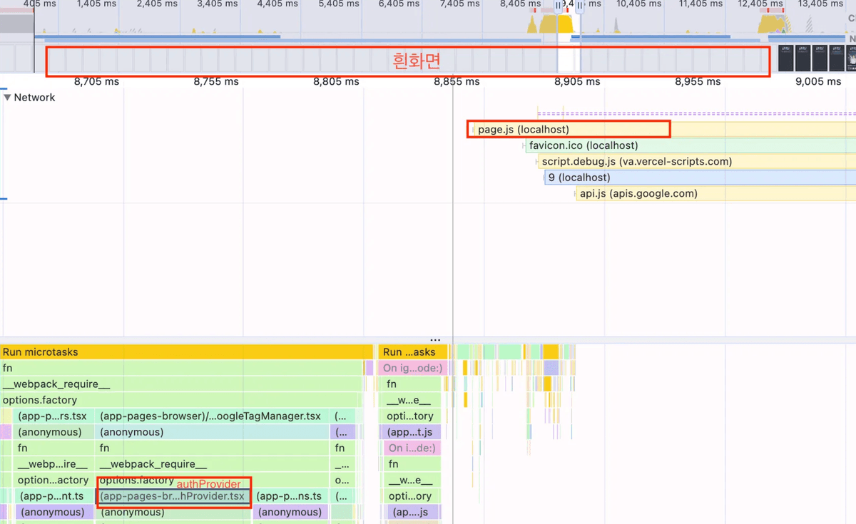 AuthProvider가 렌더링을 차단하고 있다는 생각이 들어서 코드를 살펴보니, 인증이 완료되기 전까지 null을 리턴하고 있었다.