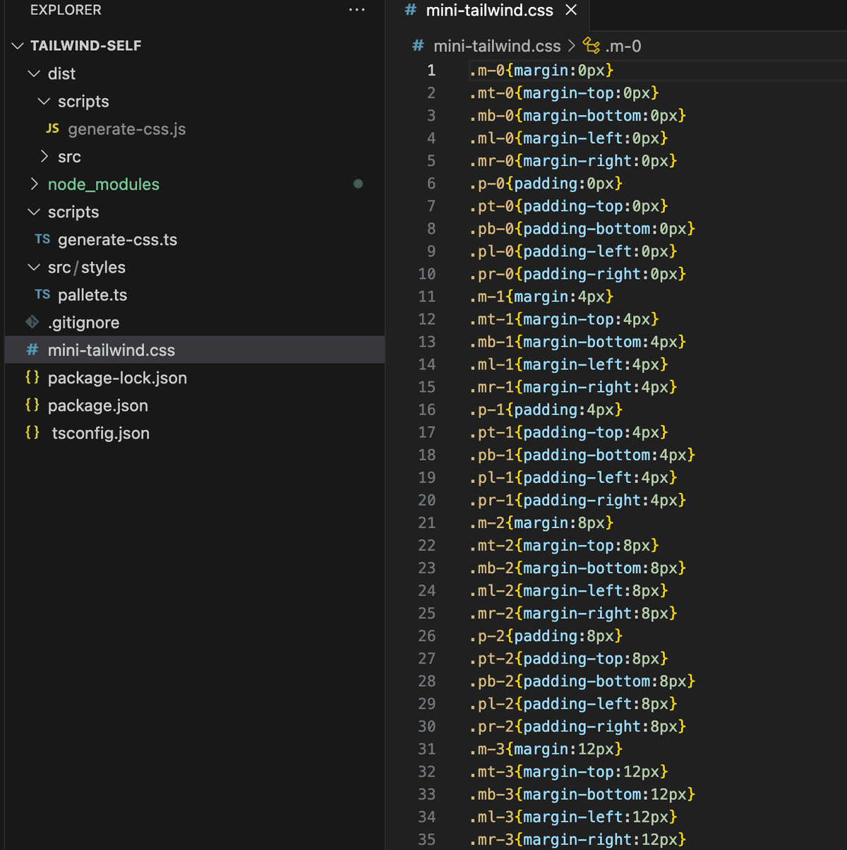 import { writeFileSync } from "fs"; import { colors, spacing, fontSize } from "../src/styles/pallete"; let css = ""; for (const [key, value] of Object.entries(spacing)) { css += `.m-${key}{margin:${value}}\n`; css += `.mt-${key}{margin-top:${value}}\n`; ... } for (const [name, value] of Object.entries(colors)) { css += `.bg-${name}{background-color:${value}}\n`; css += `.text-${name}{color:${value}}\n`; } for (const [name, value] of Object.entries(fontSize)) { css += `.text-${name}{font-size:${value}}\n`; } css += ` .flex{display:flex} ... .justify-start{justify-content:flex-start} .justify-center{justify-content:center} ... `; writeFileSync("mini-tailwind.css", css);