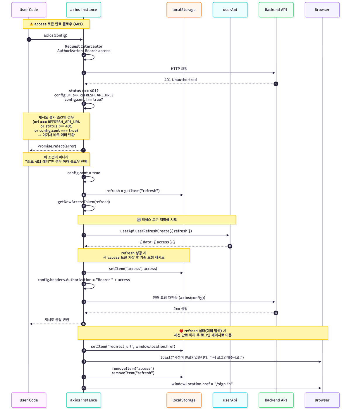 config.url === REFRESH_API_URL: refresh 요청에서 에러가 났다면 refresh 토큰이 만료되었거나 혹은 서버가 터진 것이다.status !== 401: 에러코드가 200, 300, 500, 404 등 인증만료 코드가 아닌 곳에서의 에러인데 이는 각 상황에 맞는 에러처리를 해야 한다.config.sent===true: 무한루프 방지 플래그