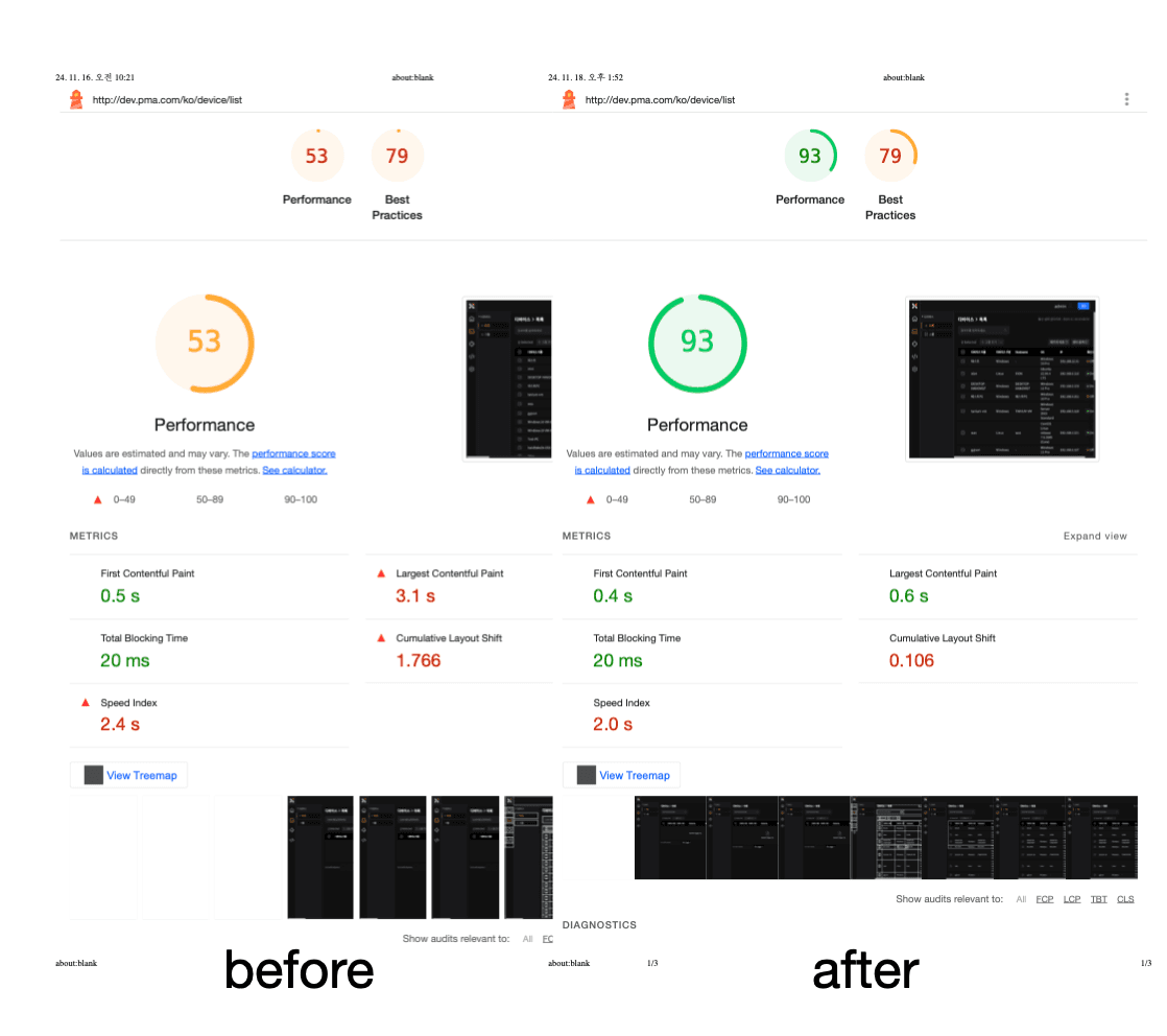 모든 데이터를 받는 부분에서 Layout Shift가 발생하고 있었다. 빈 데이터일때 처리가 되어있지 않아 스켈레톤을 넣거나, Wrapper에 사이즈를 고정시켜 해결했다.